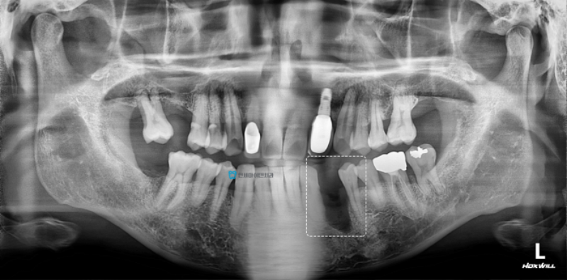 파노라마에서도 해당 부위 잇몸뼈가 많이 흡수된 것을 볼 수 있습니다.